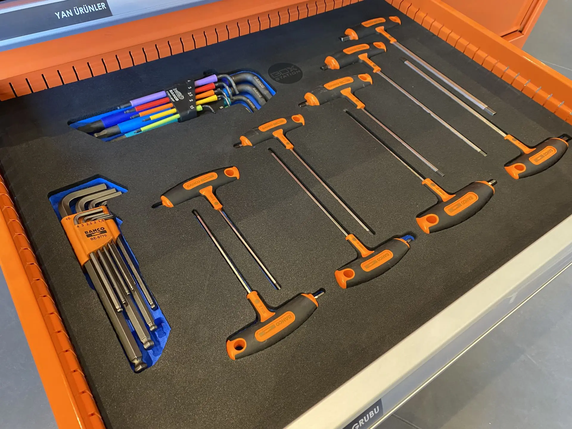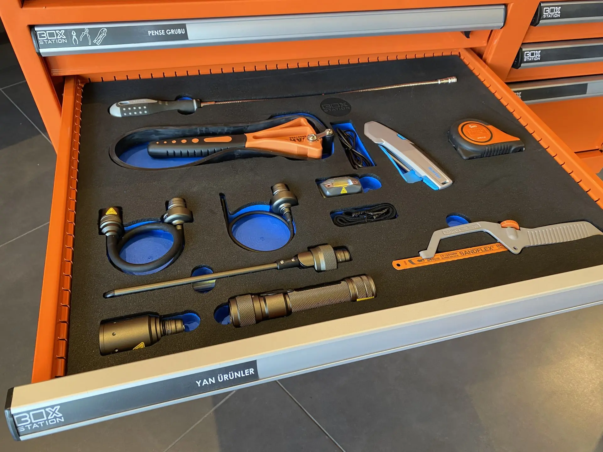 Montaj hatlarında, bakım bölümlerinde veya kalite kontrol alanlarında kullanılan el aletleri, ölçüm cihazları ve sarf malzemeleri için özel düzenleme çözümleri sunar.